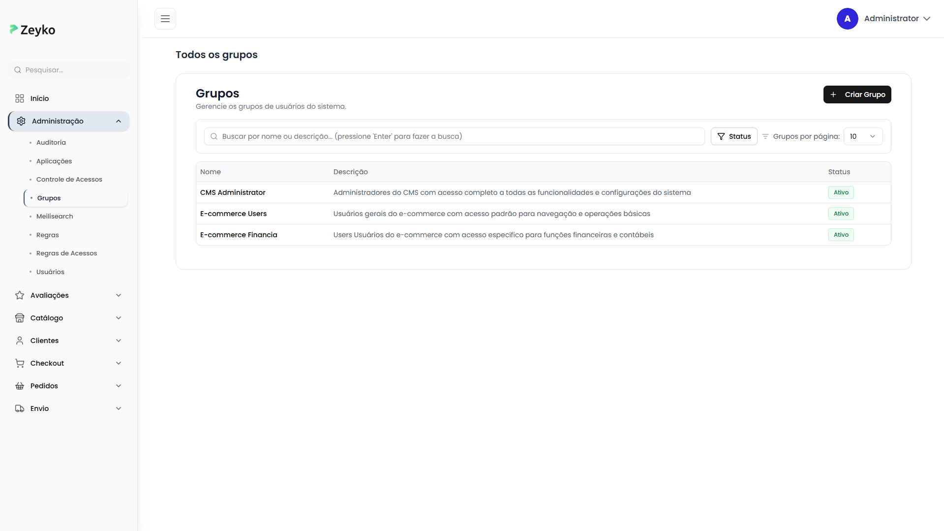 A tela de grupos está localizada no menu de Administração do sistema. Ao acessá-la, você verá: