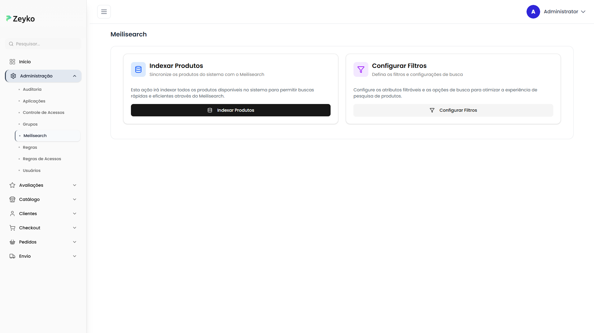 A tela de Meilisearch está localizada no menu de Administração do sistema. Ao acessá-la, você verá: