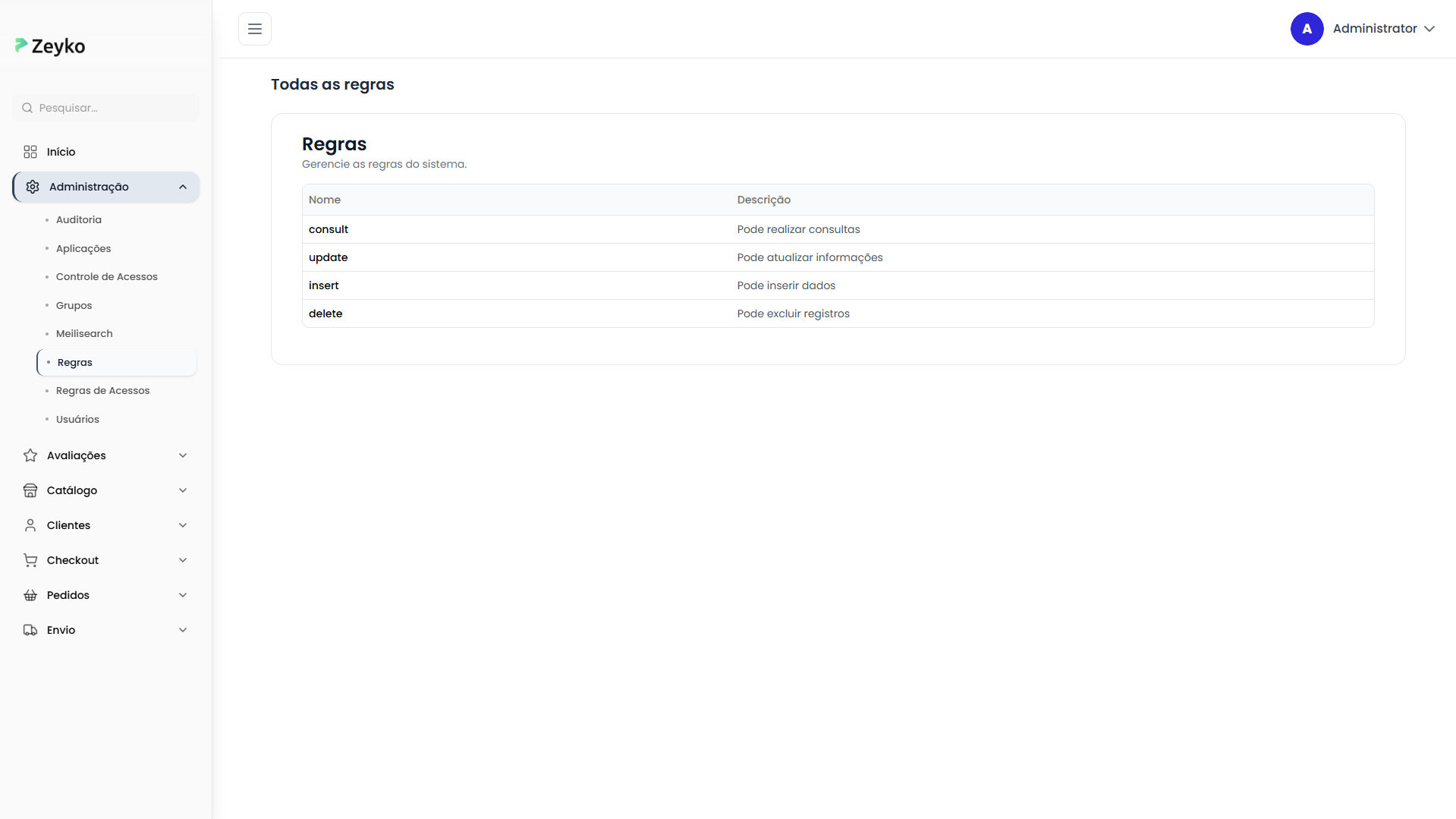 A tela de regras está localizada no menu de Administração do sistema. Ao acessá-la, você verá: