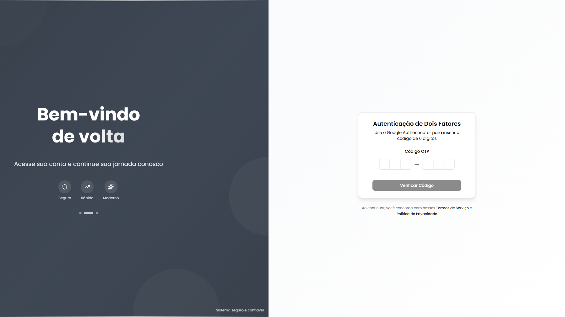 A autenticação de dois fatores (2FA) adiciona uma camada extra de segurança ao seu login. Além do email e senha, você precisará inserir um código gerado pelo Google Authenticator no seu celular.