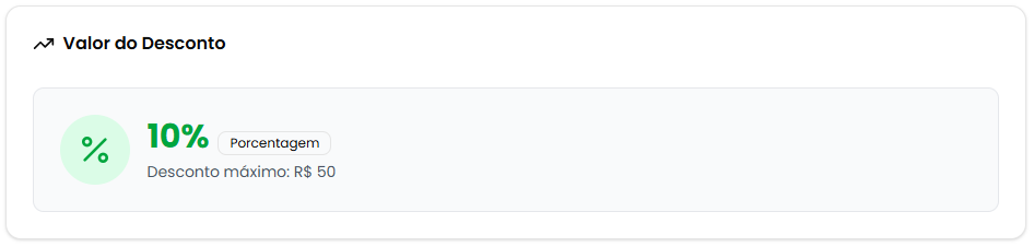 | Desconto Máximo | Limite máximo de desconto em reais para cupons de porcentagem |