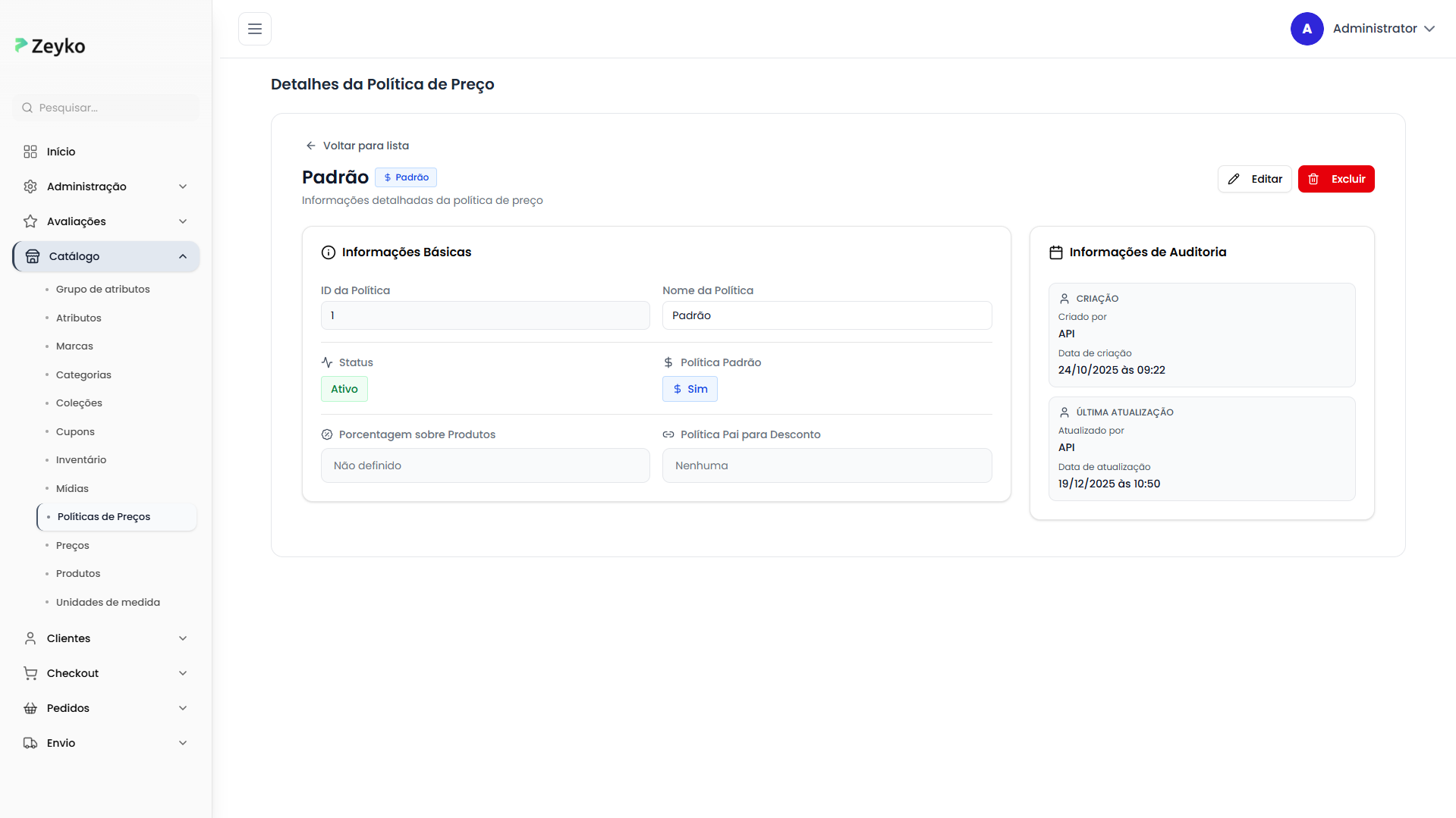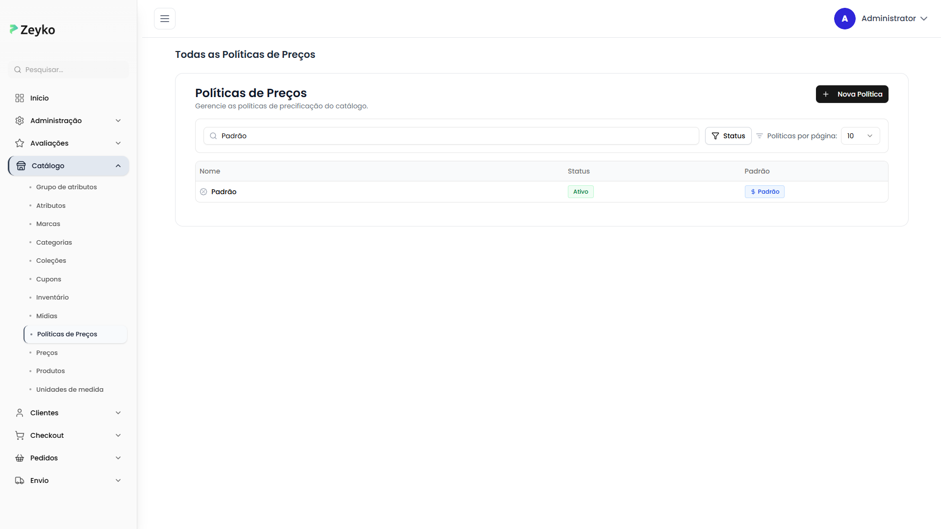 A tela de políticas de preços está localizada no menu de Catálogo do sistema. Ao acessá-la, você verá: