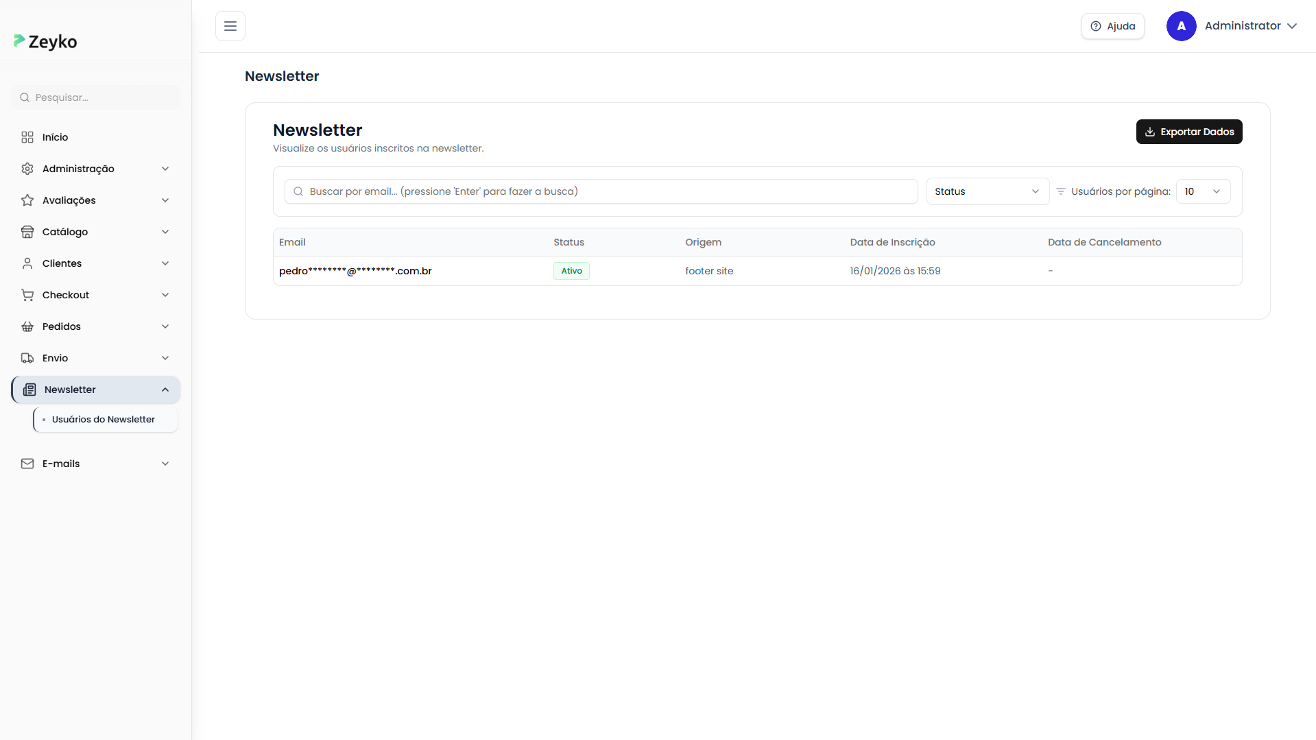 Apenas usuários com permissão de acesso à tela de newsletter podem visualizar os dados. Verifique com o administrador suas permissões.