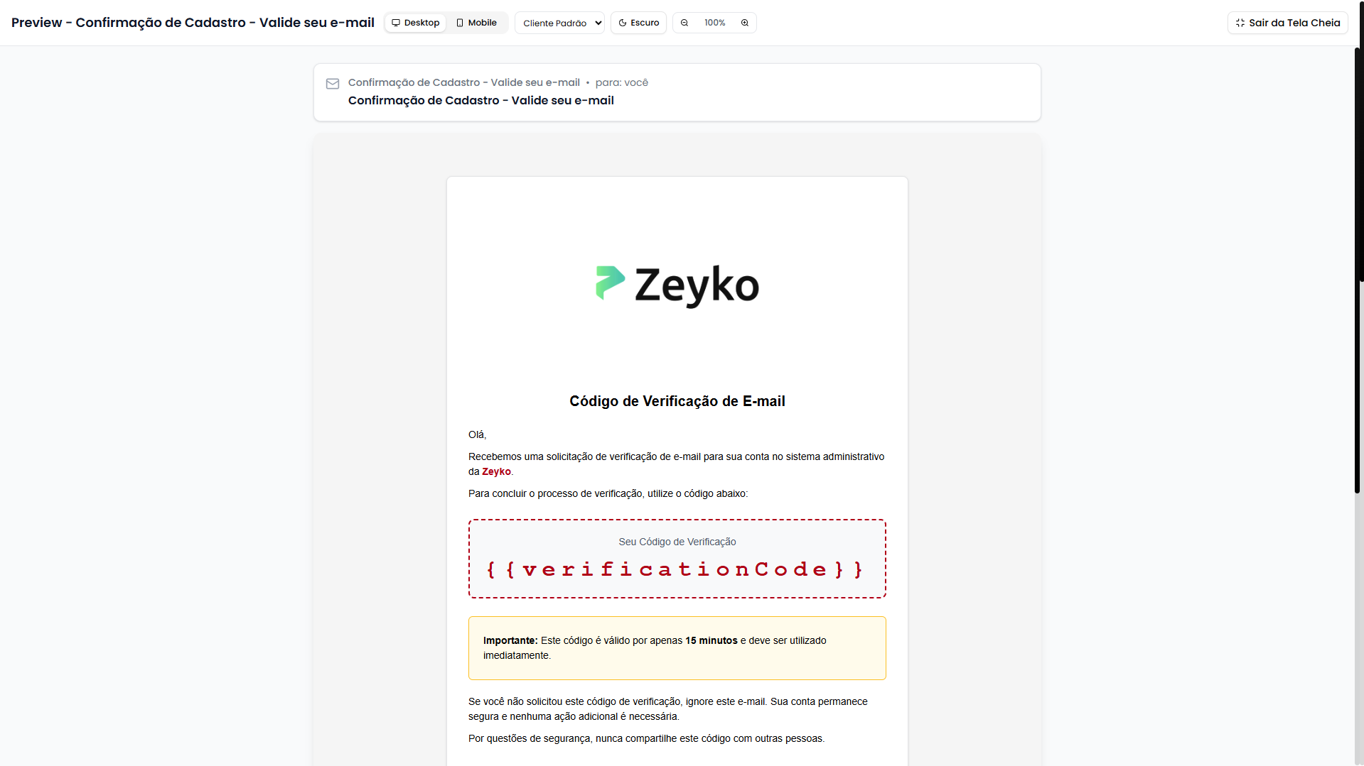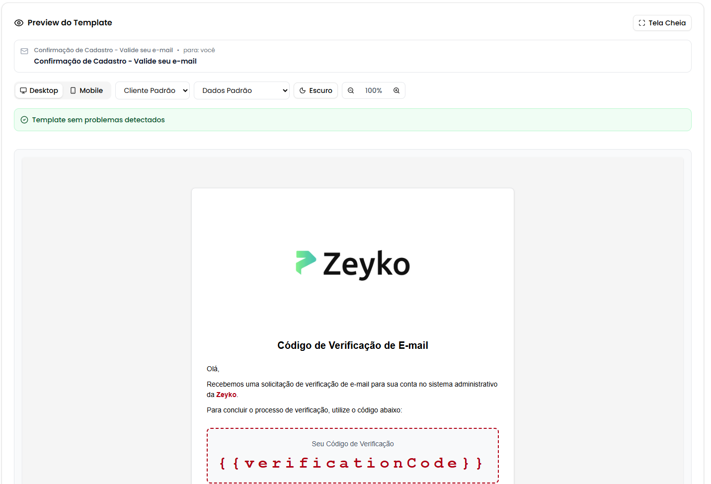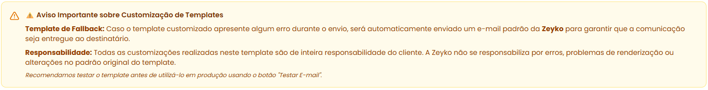 Template de Fallback: Em caso de erro no template customizado, será enviado automaticamente um e-mail padrão da Zeyko para garantir que a comunicação seja entregue.