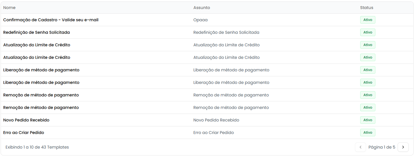 | Status | Status do template com badge visual (Ativo ou Inativo) |